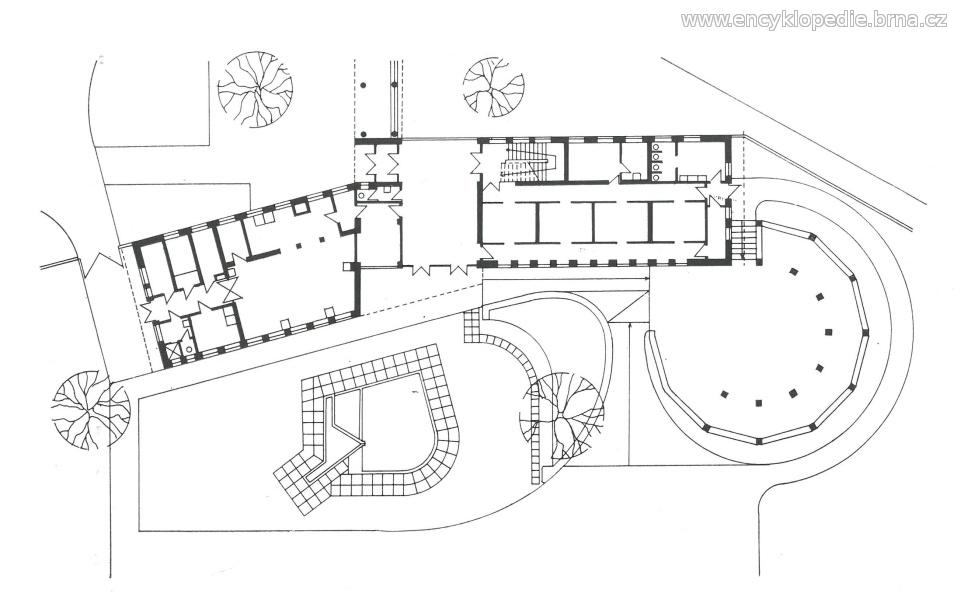 Dvě křídla svírají navzájem tupý úhel, křídlo se vstupní halou a šatnami je pravoúhle orientováno k sousední škole od Bohuslava Fuchse.