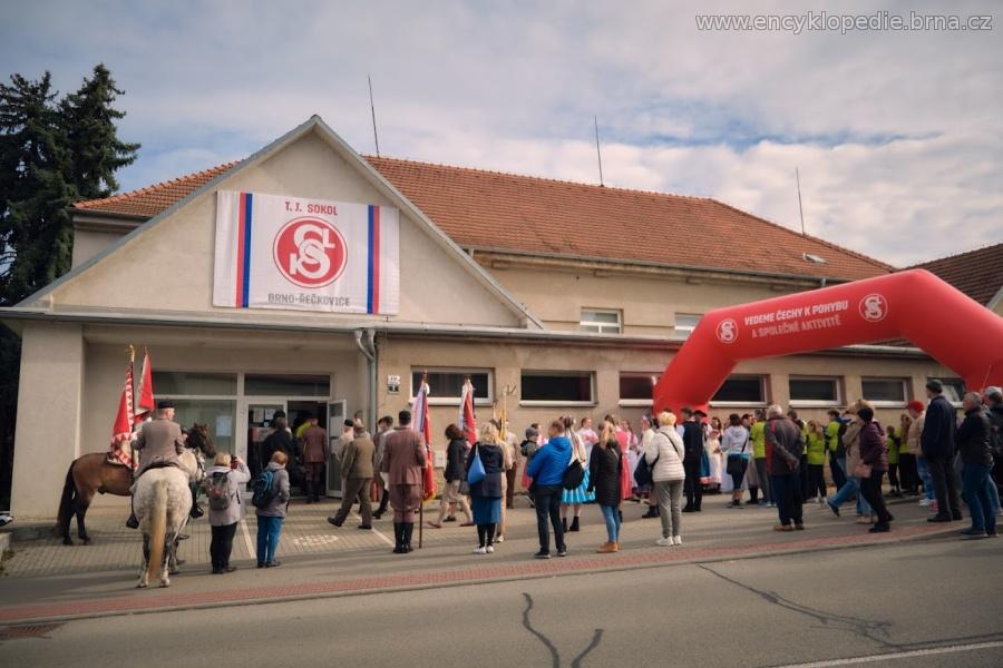 13.30 – sraz účastníků akce u kostela sv. Vavřince odkud vyšel slavnostní průvod v pořadí: sokolská stráž s koňmi i pěší, starosta MČ Brno-Řečkovice a Mokrá hora, starosta TJ Sokol Řečkovice, starosta Orelské jednoty Řečkovice, krojovaná chasa, sokolové a v závěru průvodu veřejnost.