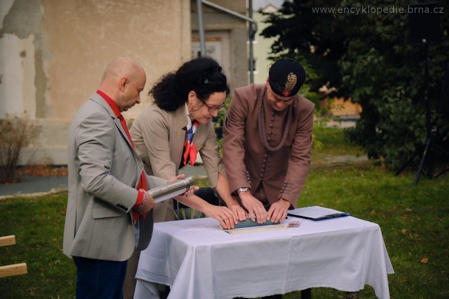 4.-5. 10. 2025 - Oslavy výročí 125 let založení jednoty Sokol Řečkovice a 100 let položení základního kamene sokolovny - vkládání pamětního listu do ochranné schránky. Zprava starosta (Marek Gut), náčelnice (Eva Janovská) a člen výboru Sokola Řečkovice (Roman Ondruška). Zdroj: TJ Sokol Brno-Řečkovice.