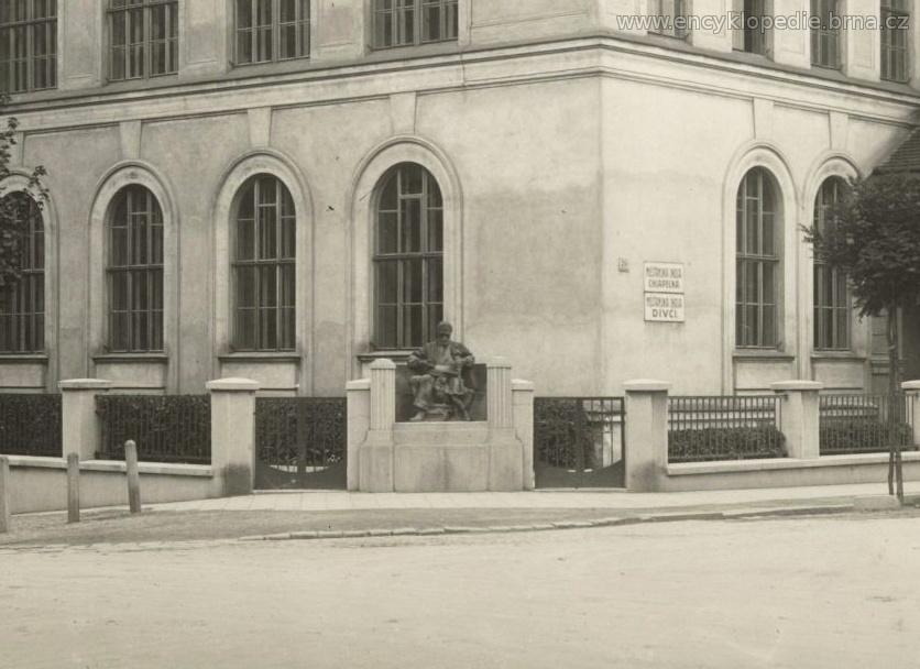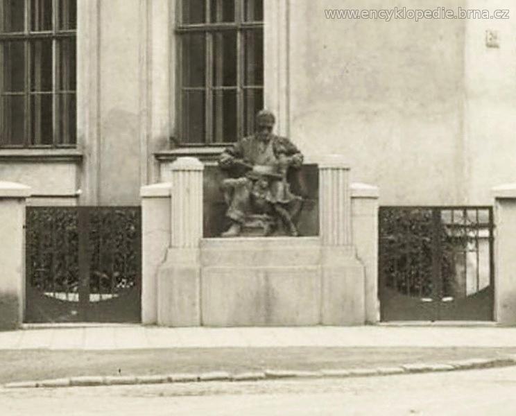 Sousoší Učitel s děvčátkem na nároží zídky před budovou školy na Kotlářské 4. Zdroj: AMB X.c 58 (výřez fotografie).