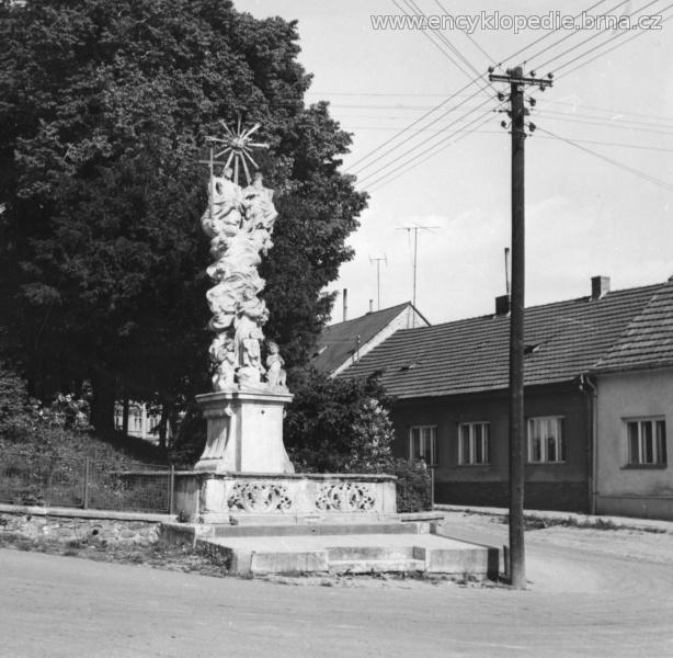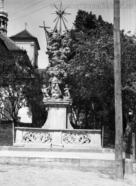 na hranolovitém podstavci s volutovými křídly je umístěn sokl, z něhož vyrůstá oblačný sloup s okřídlenými andílčími hlavičkami, na vrcholu sloupu je osazeno ústřední sousoší Nejsvětější Trojice v obvyklé ikonografii - postava Ježíše Krista vlevo, postava Boha Otce vpravo, mezi nimi holubice Ducha Svatého upevněná v centru mohutné kovové paprsčité glorioly; u paty sloupu je umístěna stojící figura Panny Marie Immaculaty; vše ohrazeno dekorovanou kamennou zídkou; sousoší je značně poškozeno