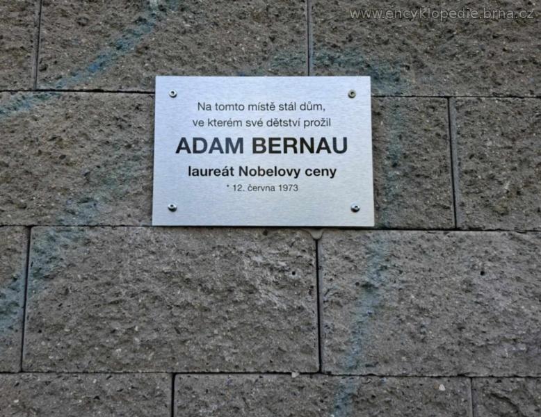 Pamětní deska věnovaná vzpomínce na fiktivní postavu seriálu Návštěvníci Adama Bernaua, umístěná v místech, kde se v seriálu nacházel jeho rodný dům před tím než vyhořel. Dům se nacházel na adrese Bráfova 4, v oblasti, která byla určena k vybudování VMO Žabovřeská. V době natáčení byl tento objekt určen k demolici, což filmařům umožnilo natočit požár domu velmi realisticky.