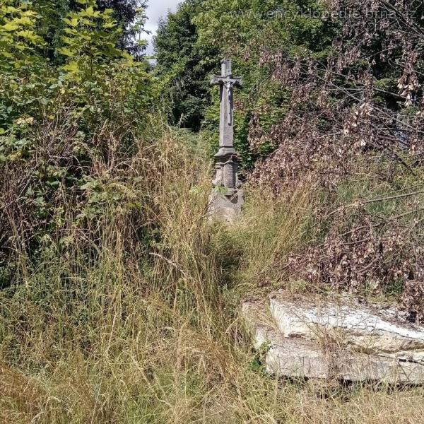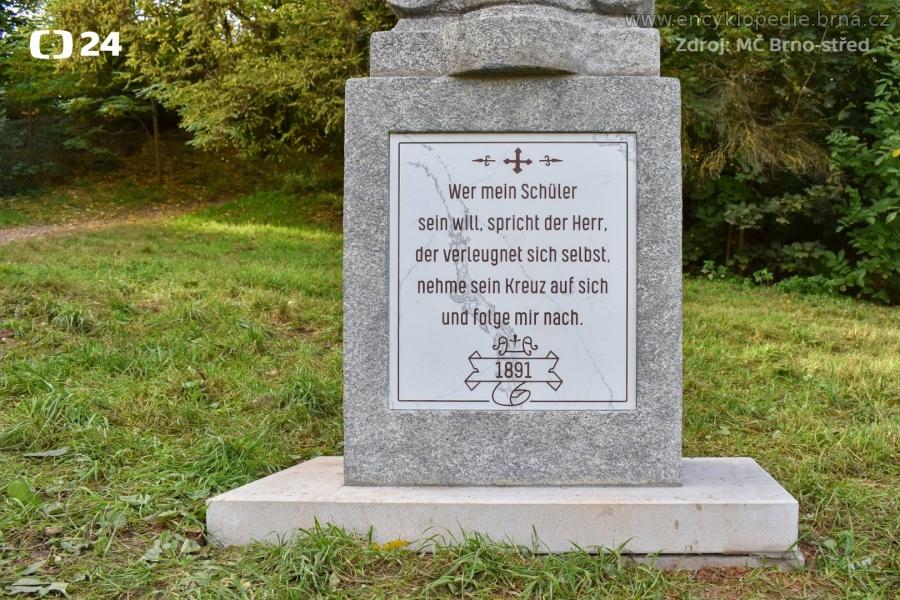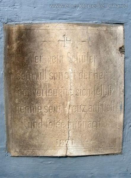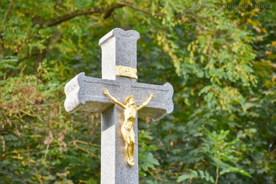 kamenný kříž se zlacenou postavou Krista, zlaceným nápisem INRI a s německým nápisem umístěným na soklu kříže; překlad nápisu: "Kdo chce být mým učedníkem, praví Pán, ať zapře sám sebe, vezme svůj kříž a následuje mě."