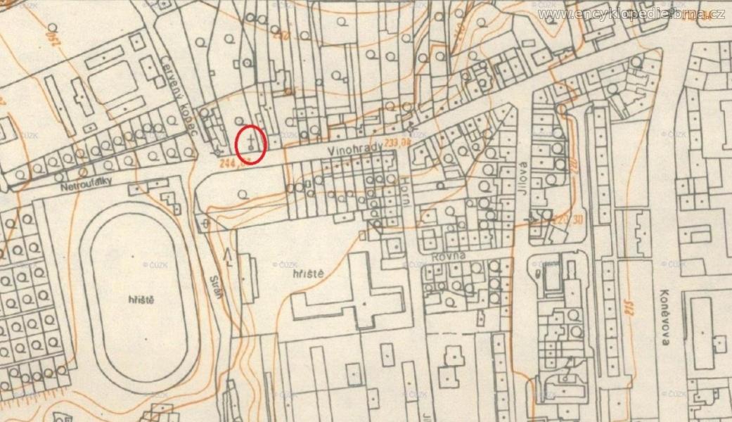 Kříž z roku 1891 původně stával v zahradě na adrese Vinohrady 48. V roce 2009 byl kříž z důvodu výstavby bytového domu přemístěn do areálu LDN. V průběhu roku 2025 pak byl kříž zrestaurován a přemístěn o několik set metrů dál, na louku nad Kamennou kolonií. Opravu kříže i jeho přemístění iniciovala MČ Brno-střed. Ta také hradila finanční náklady, které činily necelých 400 tisíc korun. Slavnostní odhalení a svěcení kříže generálním vikářem brněnské diecéze P. Pavlem Kafkou proběhlo v úterý 21. října 2025.