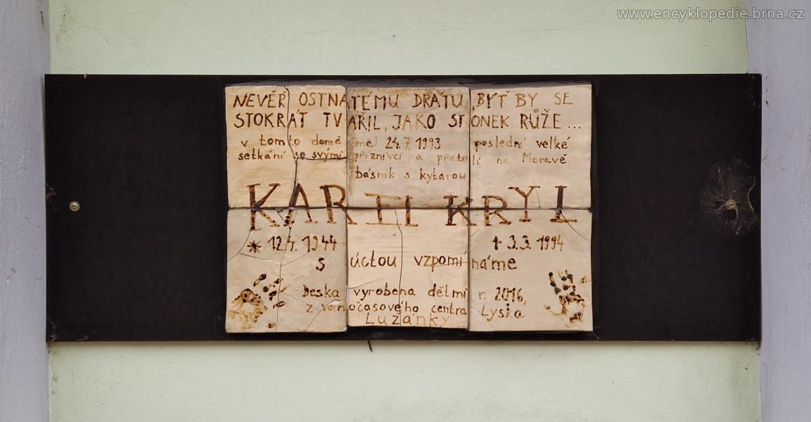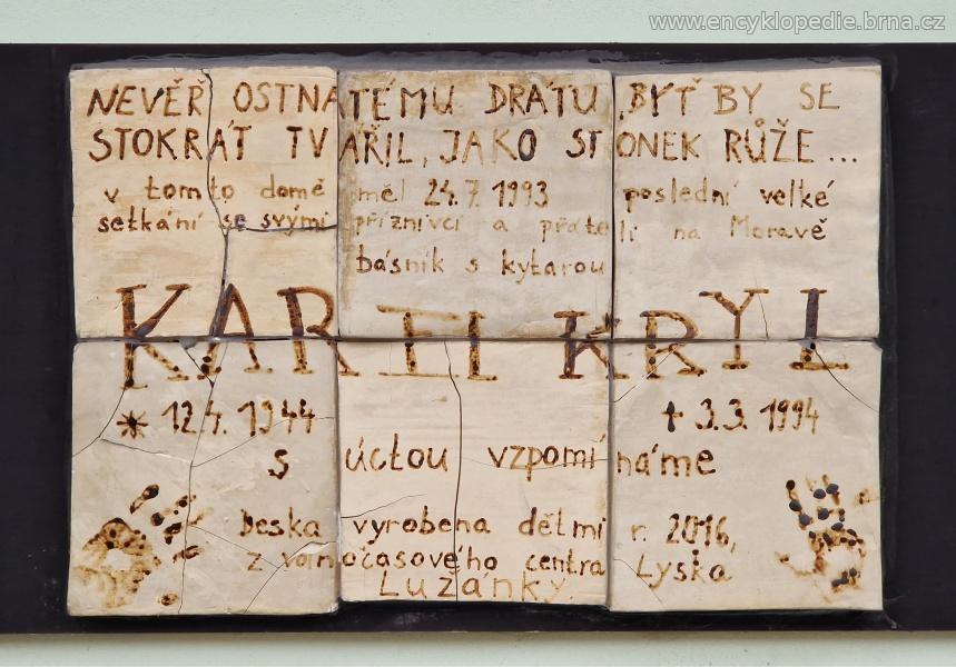 Jelikož Karel Kryl miloval děti a sám žádné neměl, vznikl nápad, že pamětní desku vytvoří právě děti. Iniciátoři vzniku pamětní desky se obrátili na Středisko volného času Lužánky, pracoviště Lyska, Oblá 51c. Jako materiál byla zvolena keramika, to proto, že K. Kryl absolvoval 13. 6. 1962 v oboru Výtvarné zpracování keramiky na Keramické škole v Bechyni. Osazení desky učinili Petr Oupor, Zbyněk Fědor a Vladimír Kalous. Autorská práva k citátu, který byl použit při ztvárnění desky, poskytla vdova po zpěvákovi, paní Marlen Kryl.