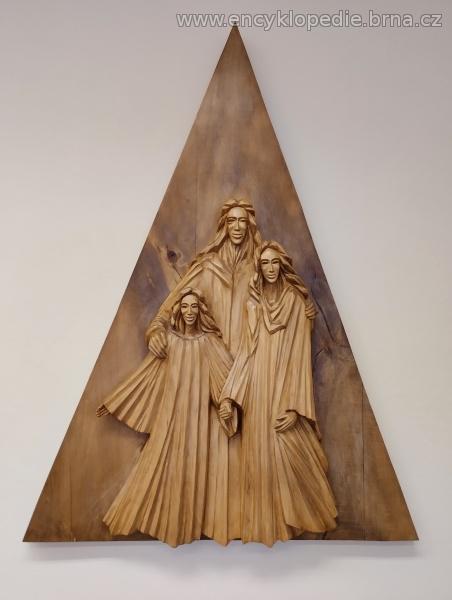 reliéfní obraz z lipového dřeva na kterém jsou plasticky ztvárněny postavy Svaté Rodiny na trojúhelníkovitém podkladu