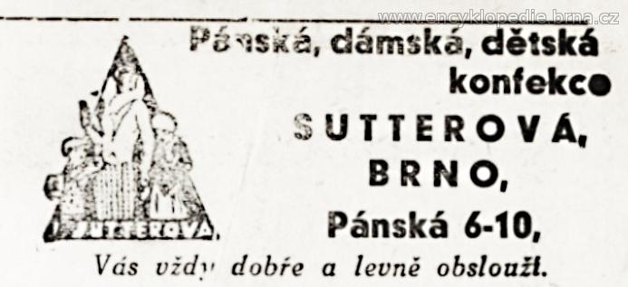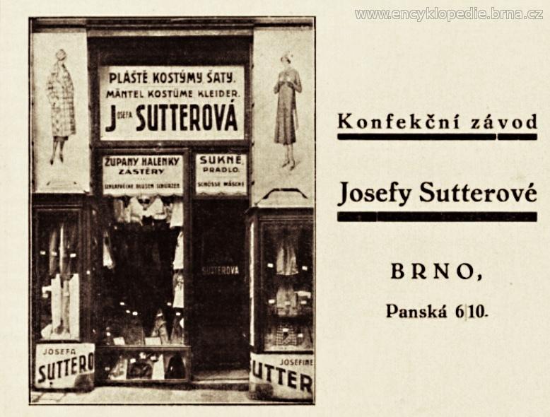 později obchod přejmenován na "Josefa Sutterová a spol., maloobchod se střižným, metrovým a módním zbožím, konfekcí a prádlem" (doloženo v roce 1948)