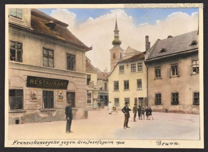 Františkánská ulice od západu. Na levé straně snímku je zachycena dvoupodlažní budova č. p. 11, v jejímž parteru jsou reklamní cedule a nápis "RICHARD CERNY // RESTAURANT // ZUR SANGESLUST". V pozadí jde vidět budovy č. p. 13 a 15 a věž kostela sv. Josefa. Na pravé straně snímku jsou zachyceny budovy č. p. 8 a 6. Rok 1900. Zdroj: MuMB, inv. č. 181003.