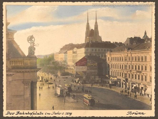Kolorovaná fotografie zobrazující pohled do ulice Nádražní v Brně směrem od výpravní budovy na západ. Je zachycena ulice Nádražní, v pravém popředí jde vidět budovu na adrese Nádražní náměstí č. p. 2 a budovu na ulici Slepá č. p. 2 / Masarykova č. p. 41, jejíž štít je pokryt reklamami. Rok 1909. Zdroj: MuMB, inv. č. 180977.