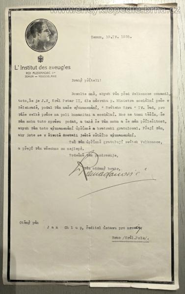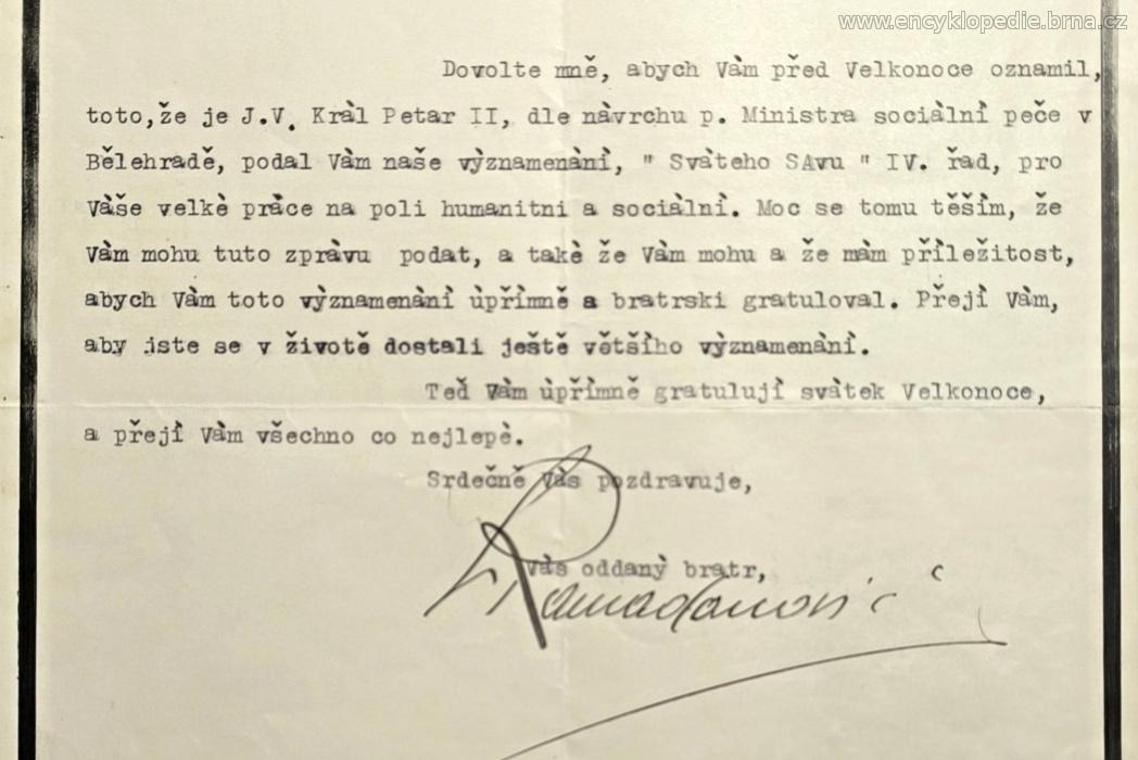 Řád svatého Sávy IV. stupně (důstojník – stužka na prsou), uděleno jeho výsostí, jugoslávským králem Petrem II. za "velkou práci na poli humanitním a sociálním", 19. 4. 1935